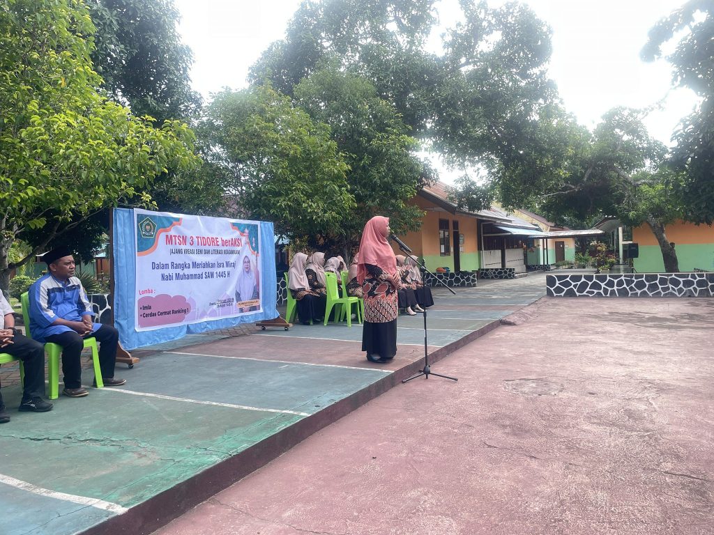 Kegiatan lomba dibuka langsung oleh Kepala MTs Negeri 3 Tidore Hj Maktum Hi Musa S.Pd Dalam sambutanya beliau mengatakan bahwa peringatan isra’ mi’raj ini untuk menumbuhkan semangat beribadah khususnya salat lima waktu, mengambil hikmah perjalanan isra’ mi’raj Nabi Muhammad SAW, menumbuhkan semangat membaca Al Quran dengam benar, dan menyampaikan pesan isra’ mi’raj.